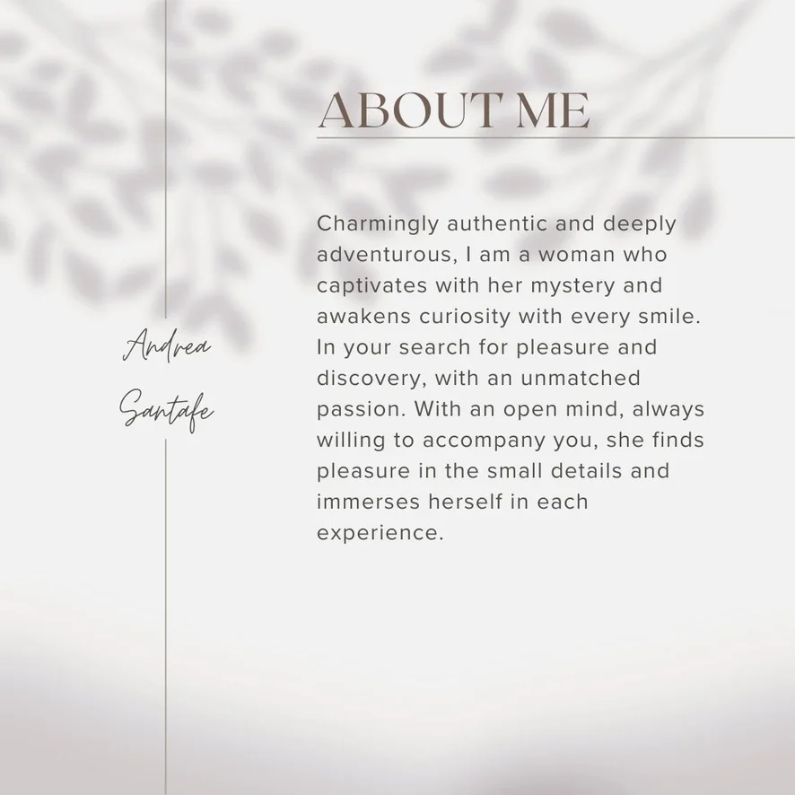 Charmingly authentic and deeply adventurous, I am a woman who captivates with her mystery and awakens curiosity with every smile. In your search for pleasure and discovery, with an unmatched passion. With an open mind, always willing to accompany you, she finds pleasure in the small details and immerses herself in each experience.